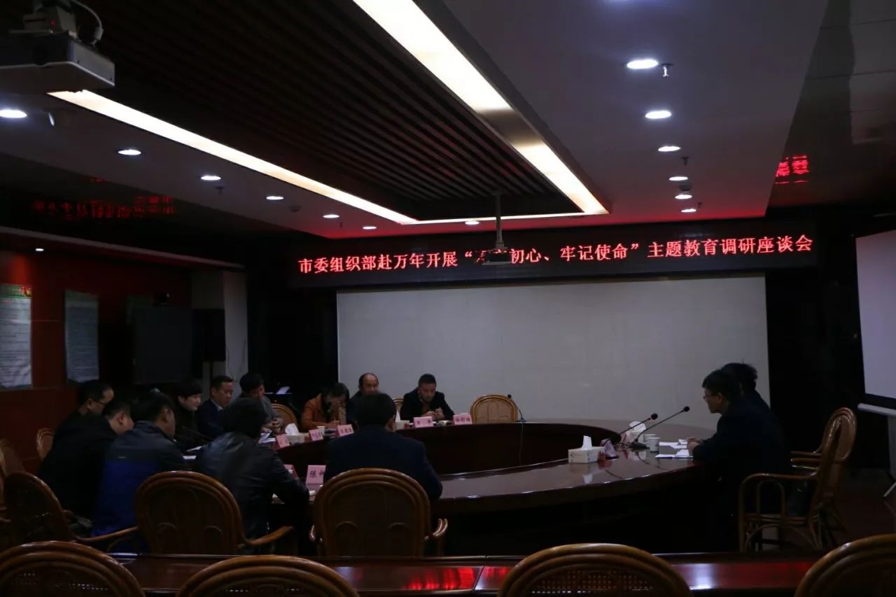 12月11日,市委组织部副部长、市非公有制经济组织与社会组织党工委书记程德冰来万年县就如何开展好“不忘初心、牢记使命”主题教育活动进行调研,并在县经济服务中心七楼会议室召开座谈会。县委常委、组织部长江俊,县委常委、宣传部长邓荣军出席会议,县直机关工委、县教体局、陈营镇、珠田乡及部分企业、社区相关负责人参加会议。